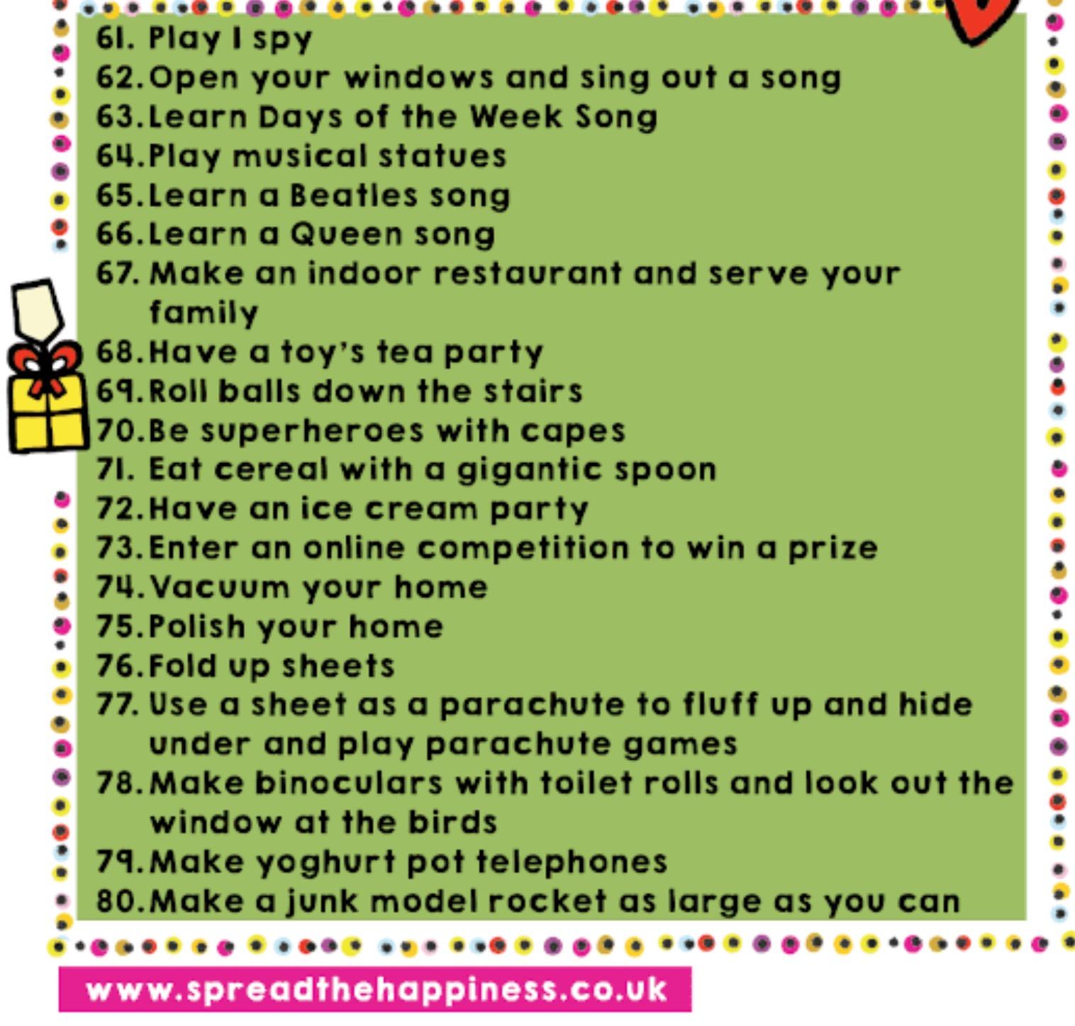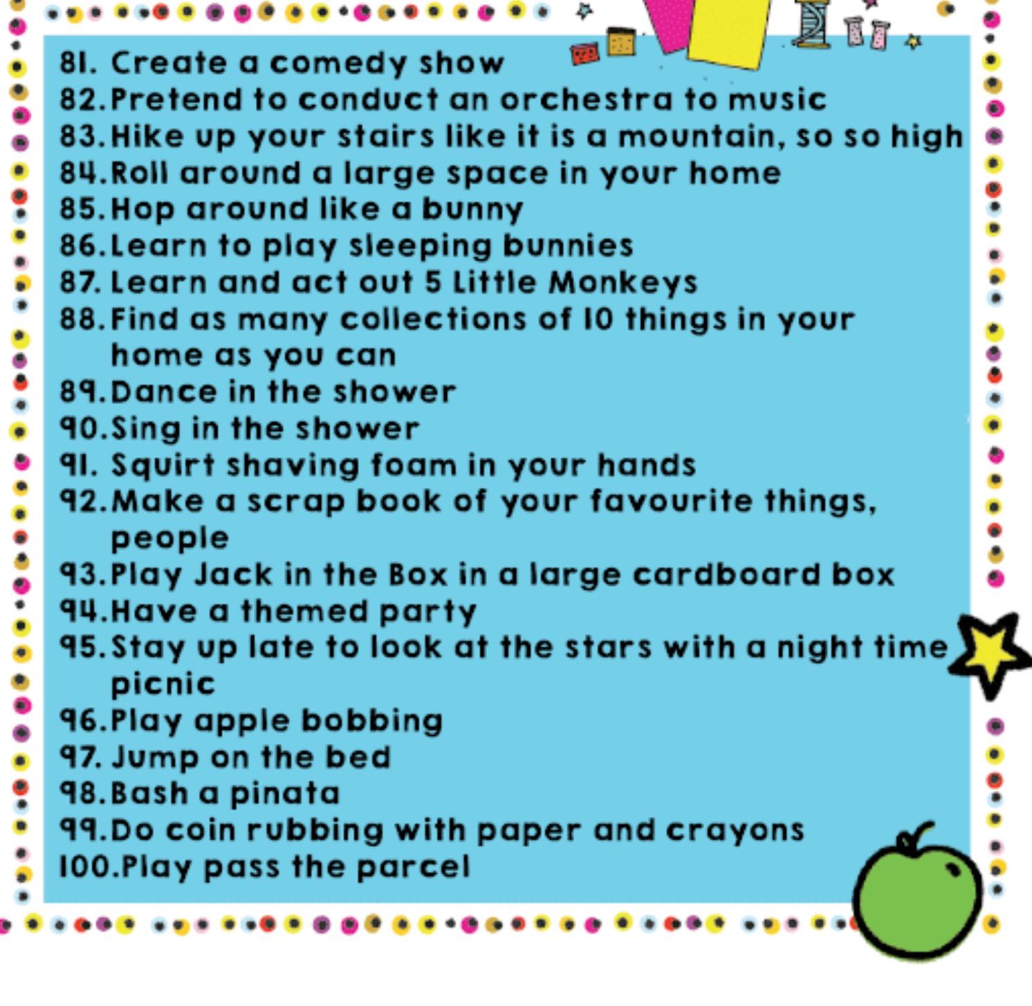 However, we also appreciate that you might want some ideas for 'Busy Learning' the children could do at home so below are some ideas of things that are similar to what we do all the time in nursery, screenshots of the parent guide to the Early Years curriculum (the full document can be found by Googling What to Expect When), some videos that we have enjoyed and a list of '100 Things to do Indoors'. We will be updating this page regularly with even more ideas so keep checking back in.