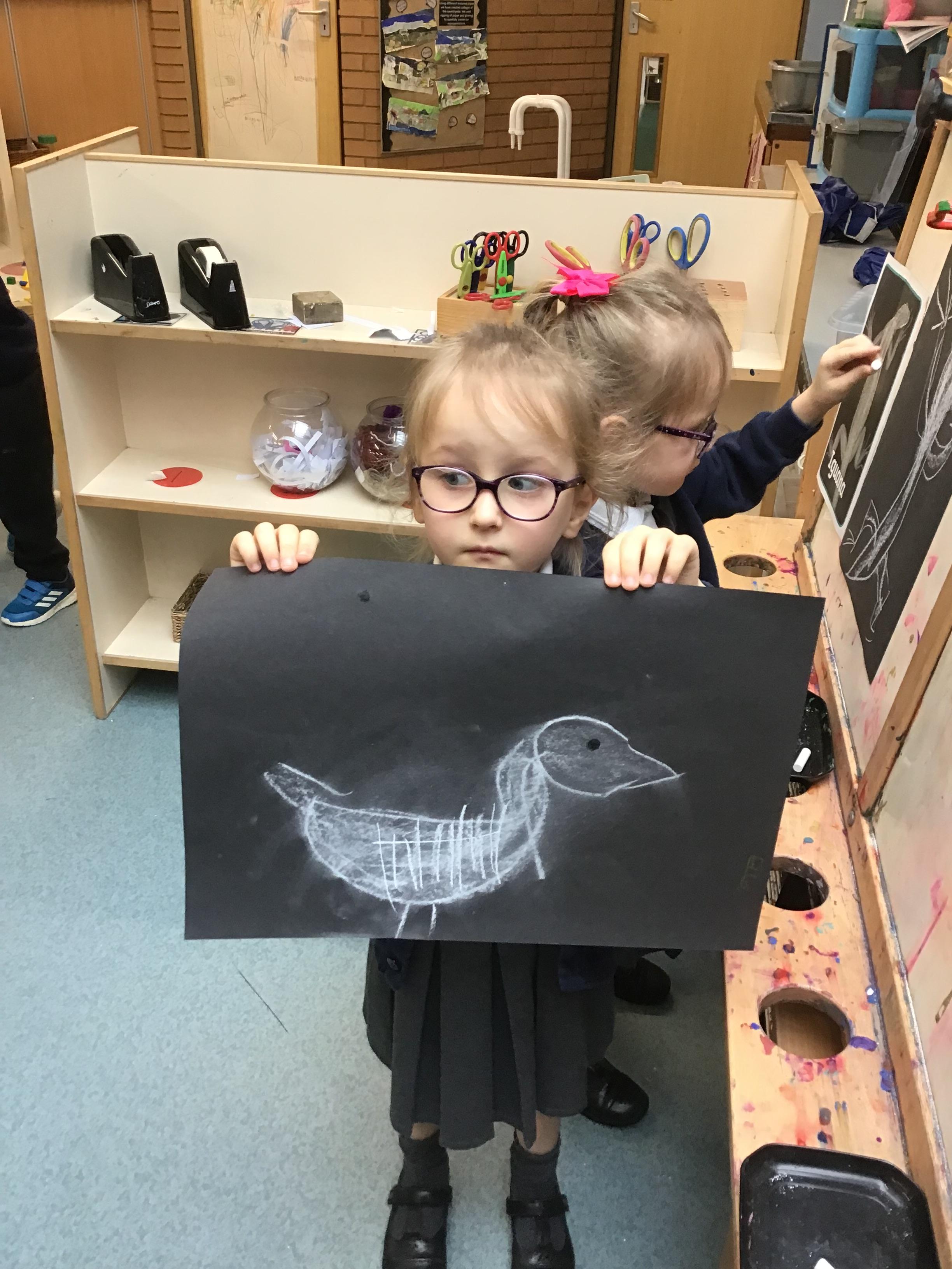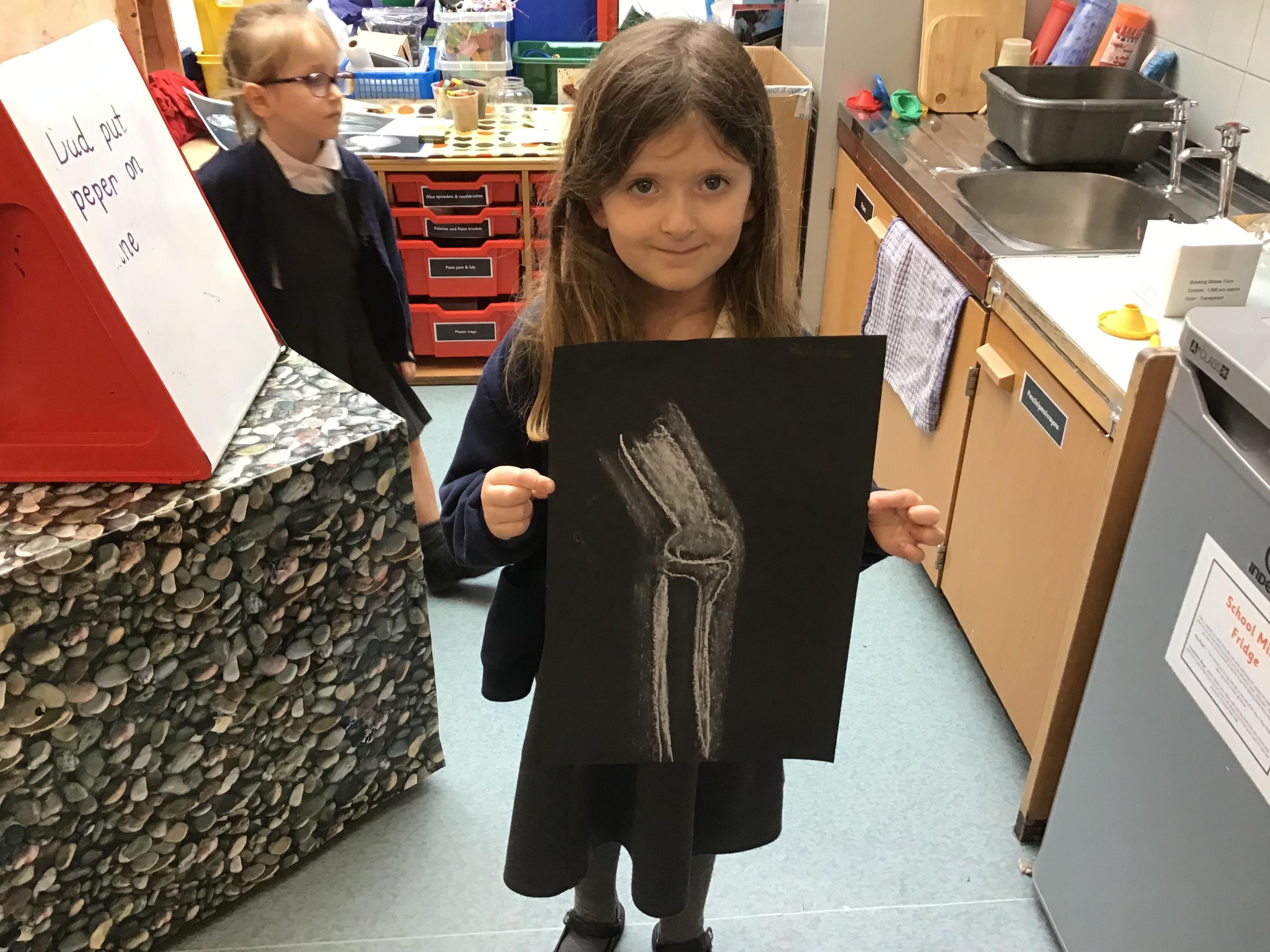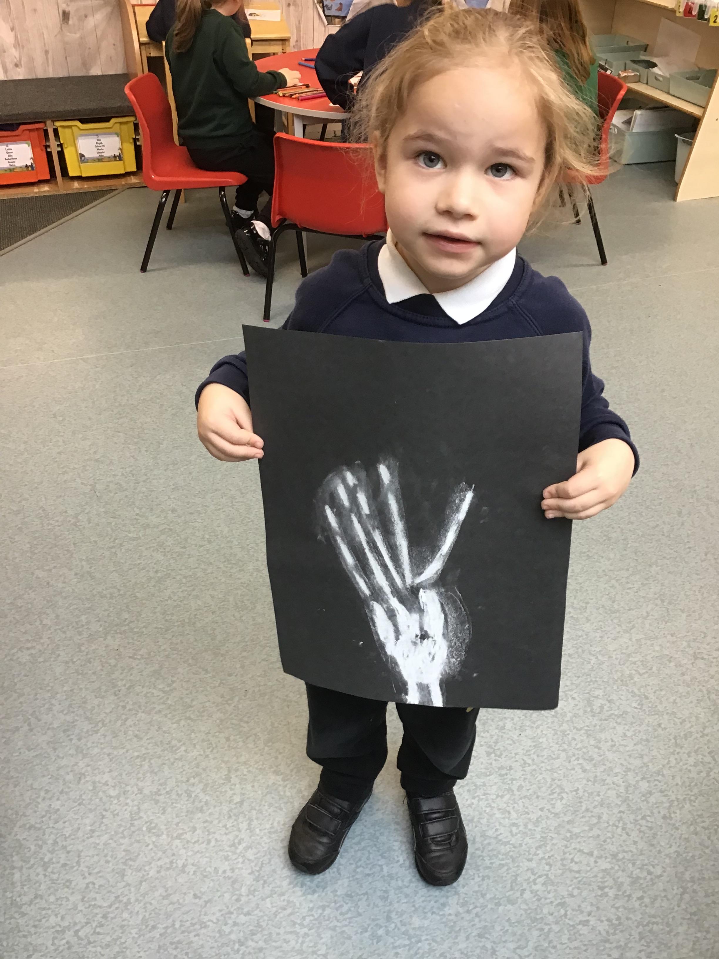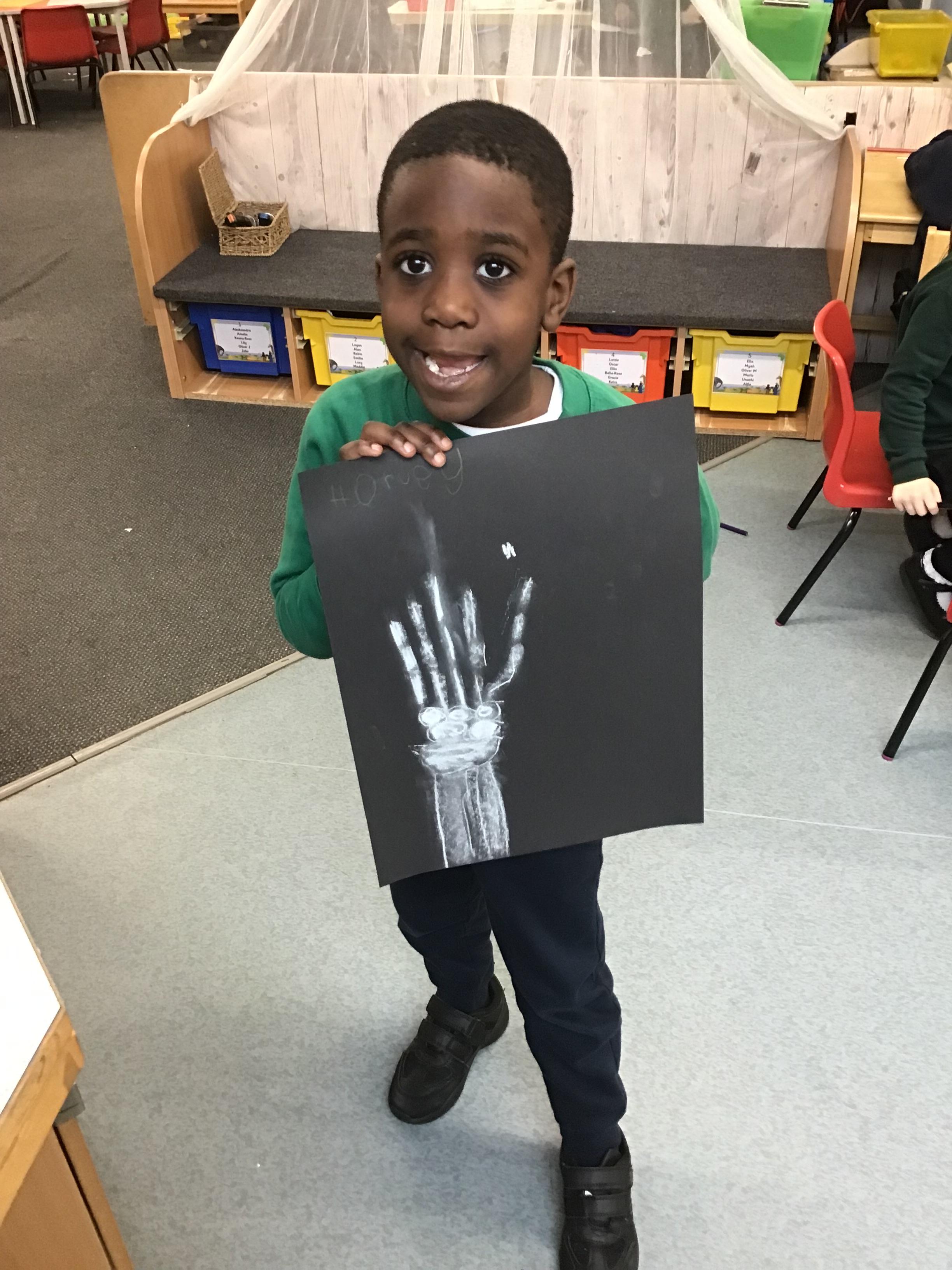 We have been learning about different jobs and looked at books about visiting the doctor or going to hospital. Look at our amazing X ray drawings using chalk on black paper