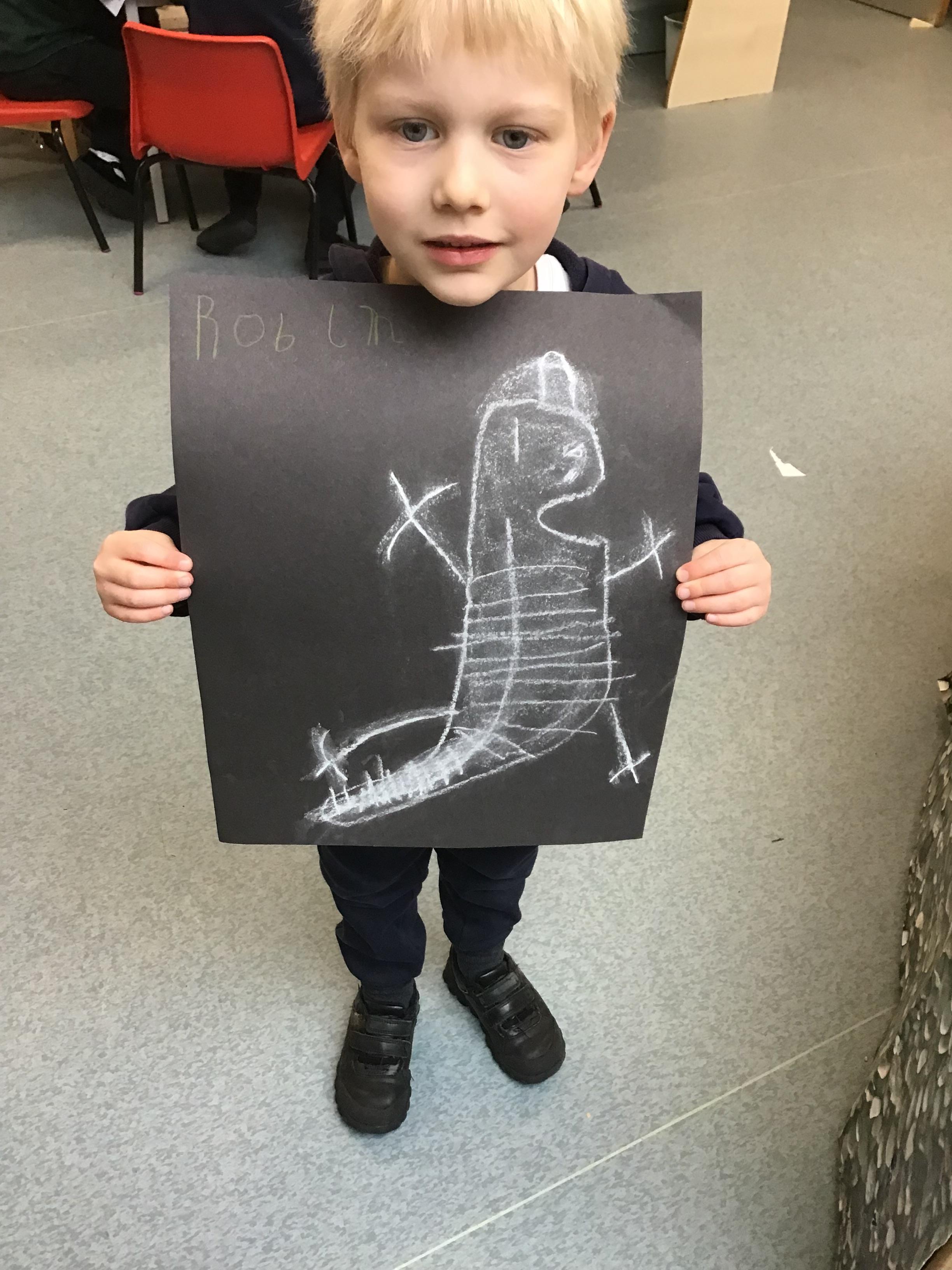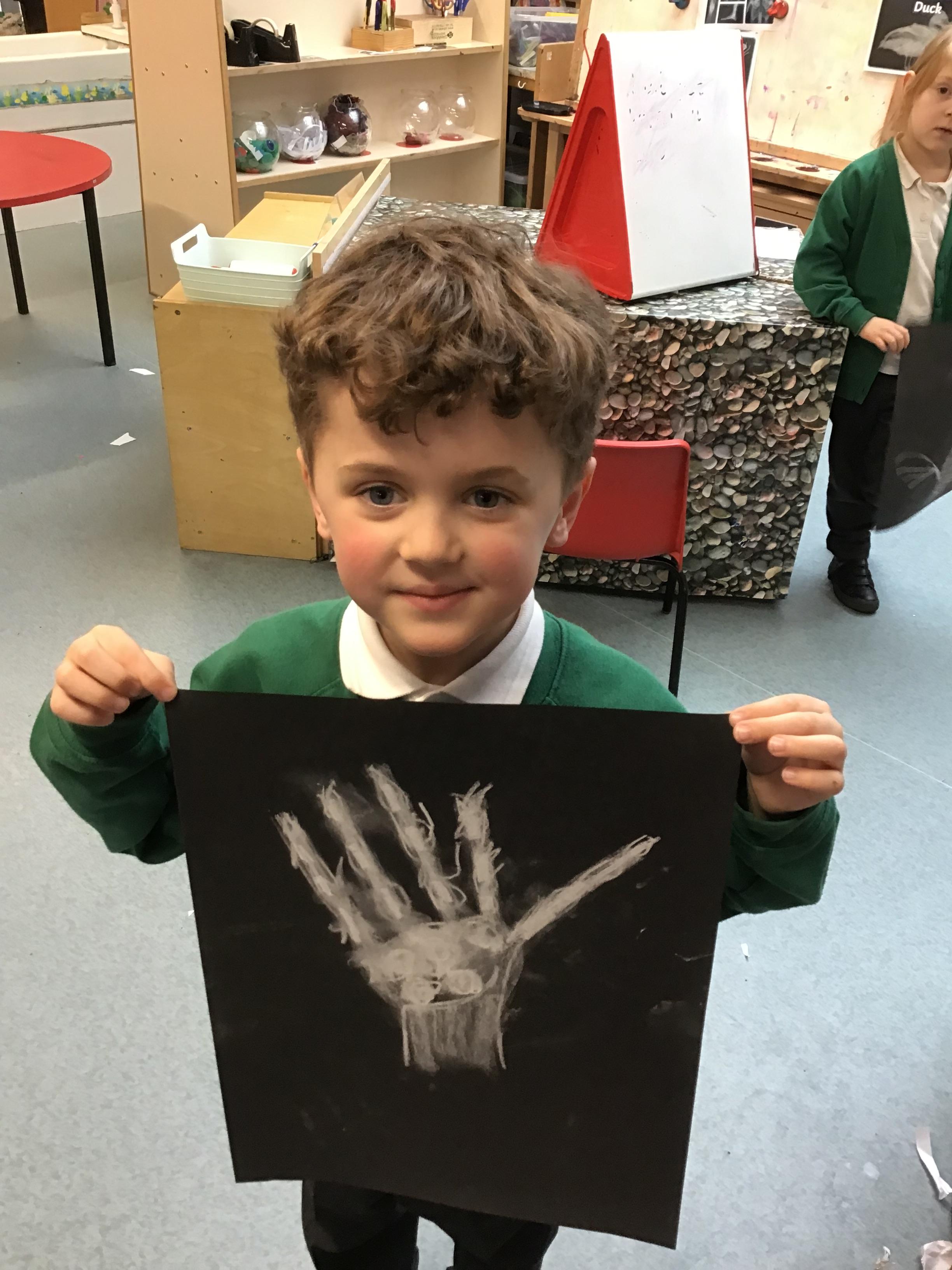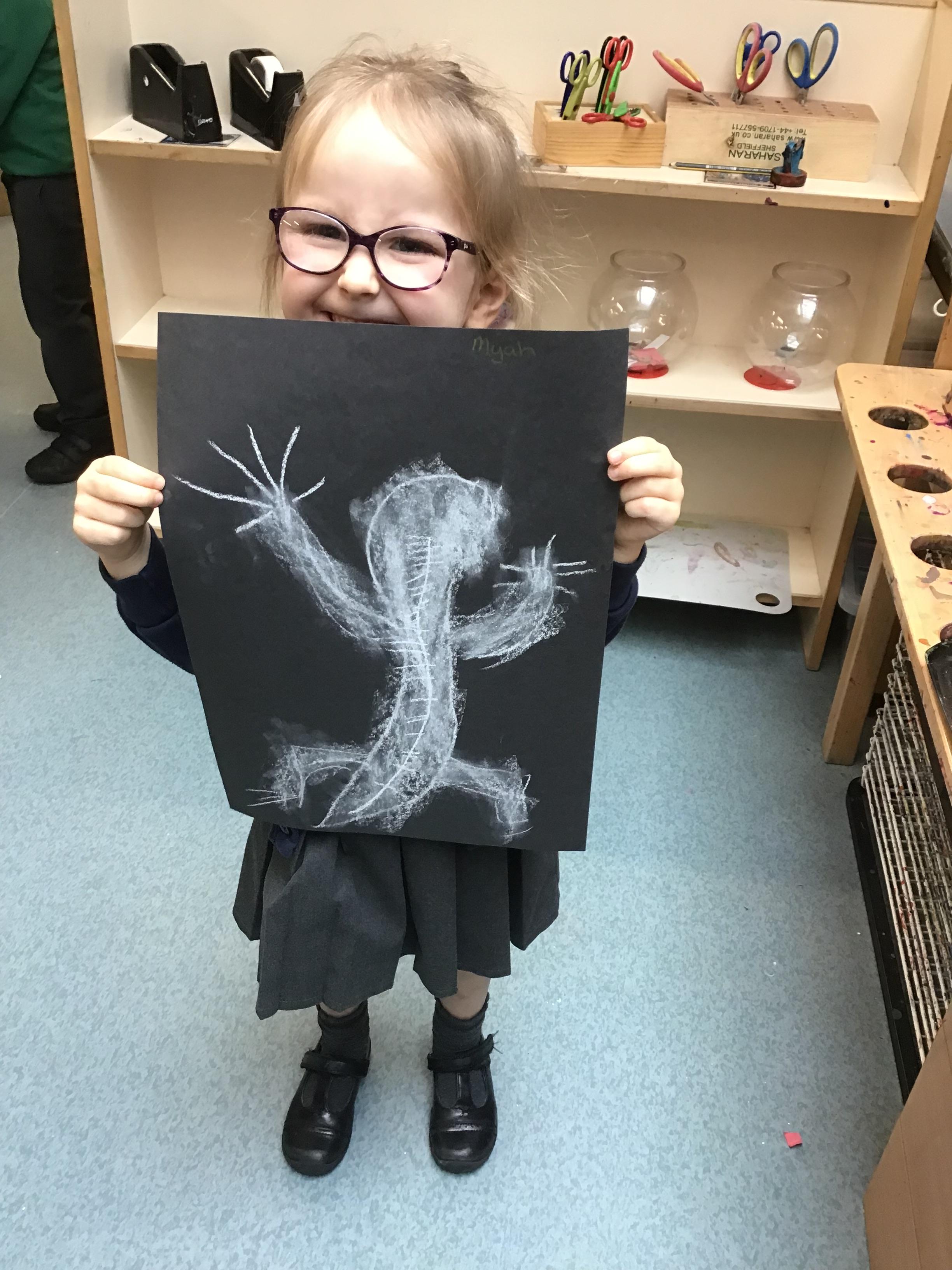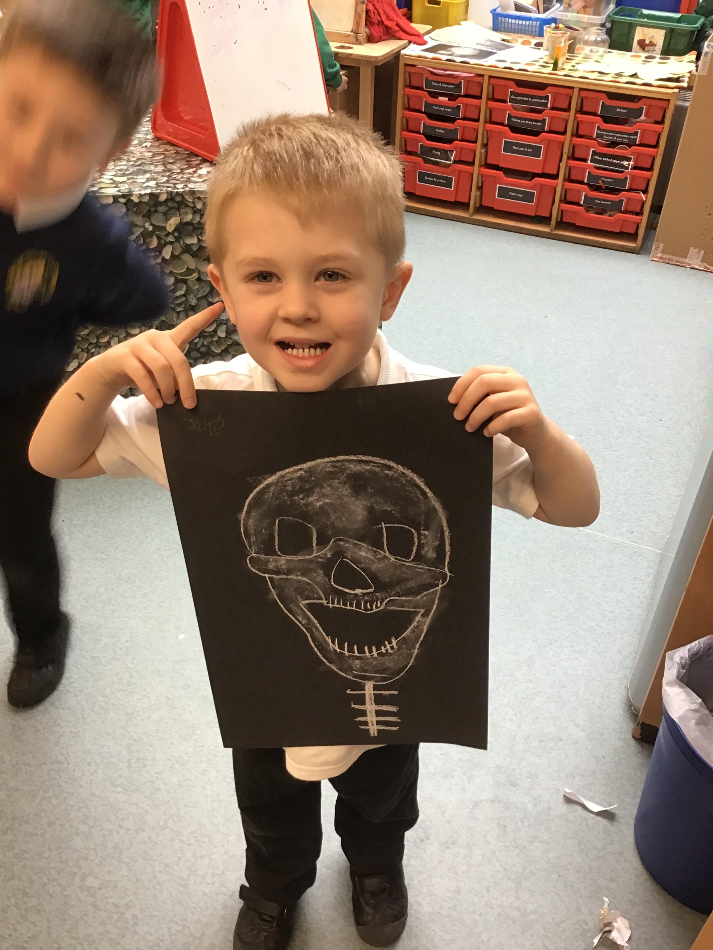 We have been learning about different jobs and looked at books about visiting the doctor or going to hospital. Look at our amazing X ray drawings using chalk on black paper