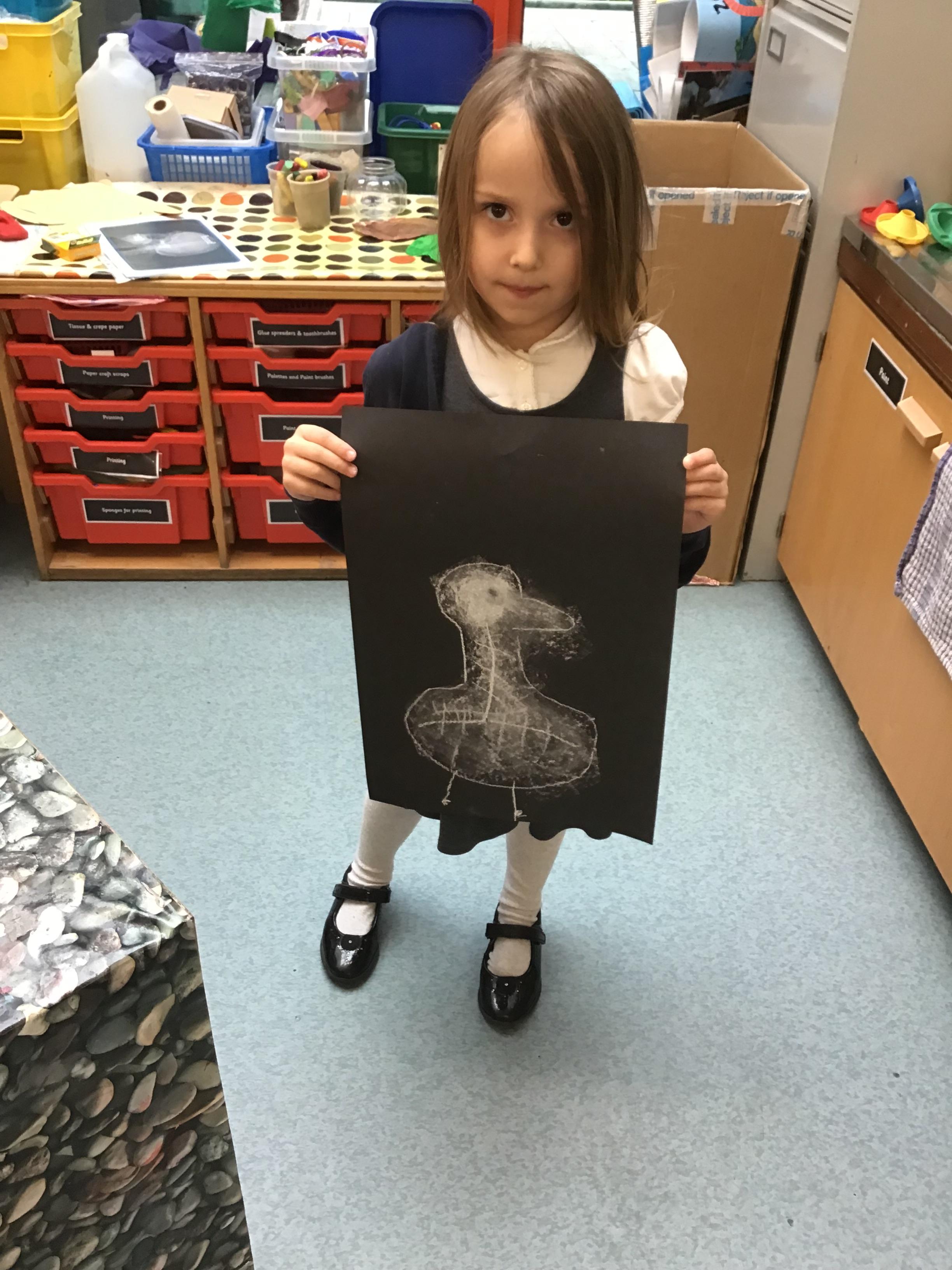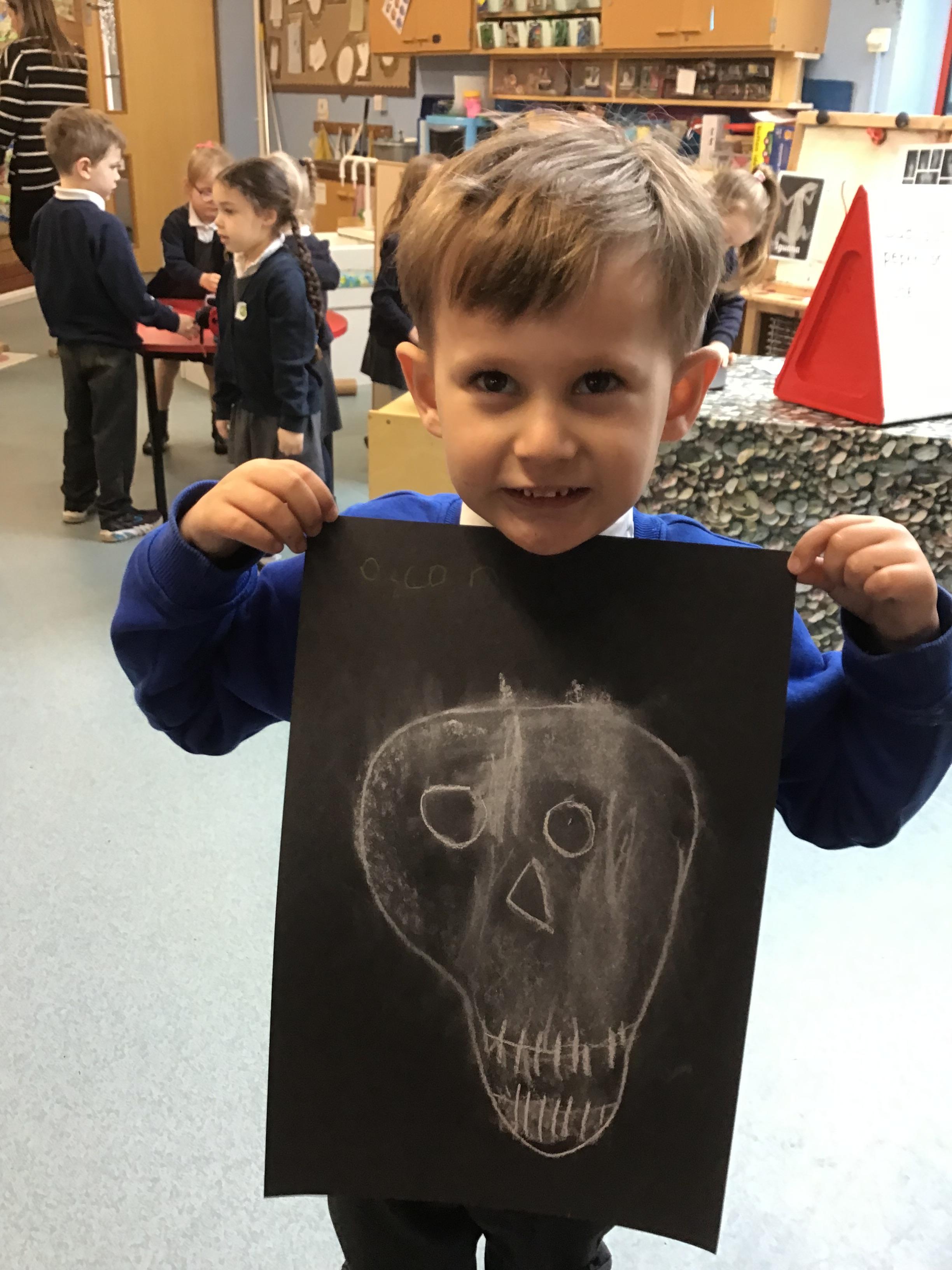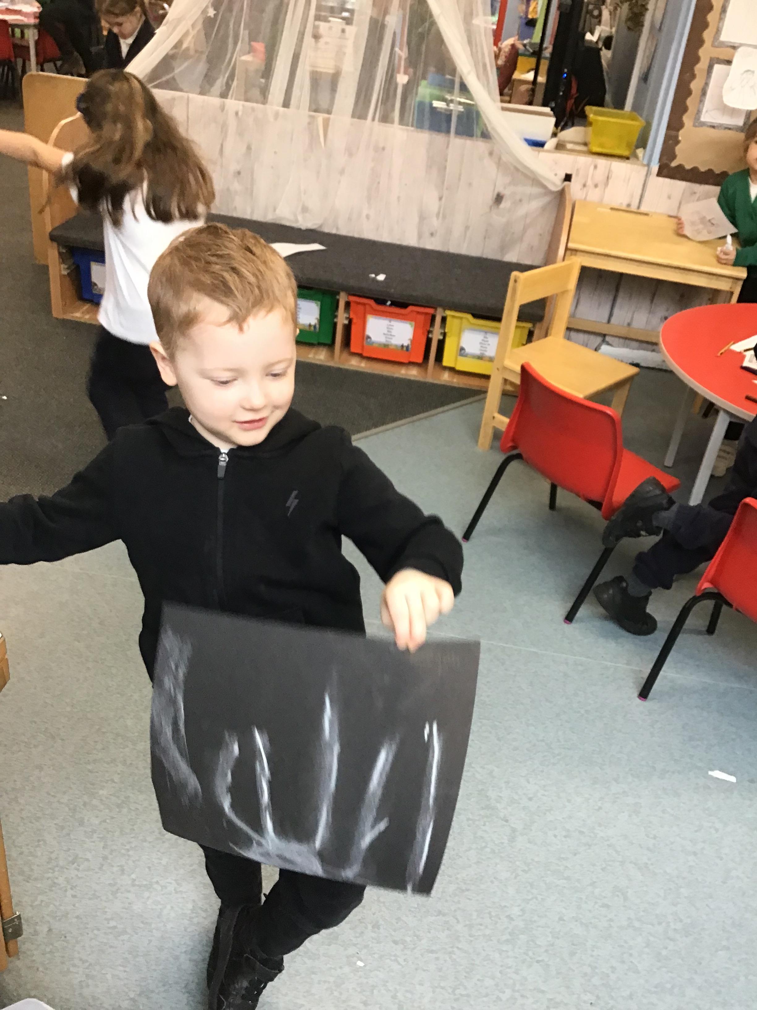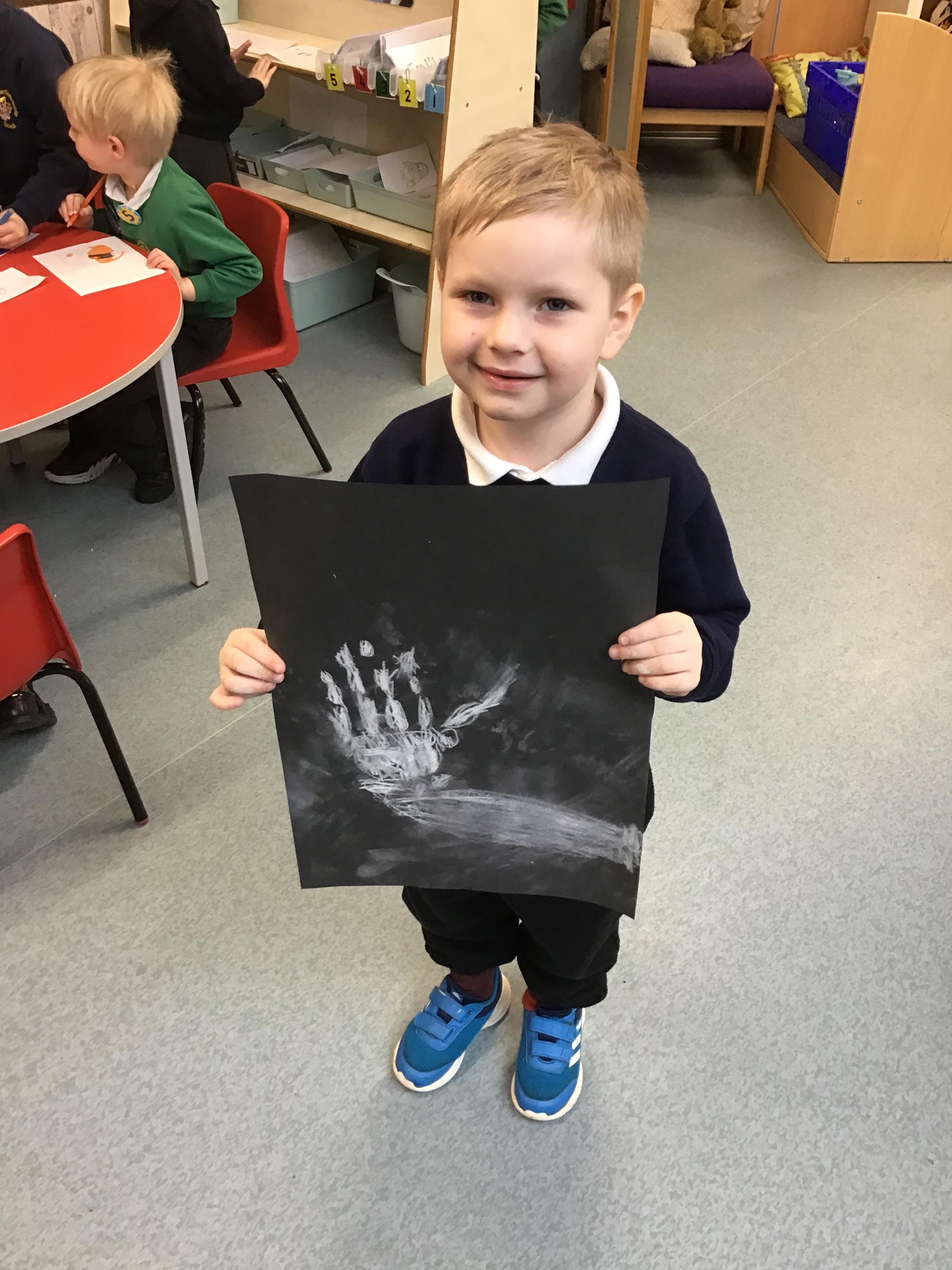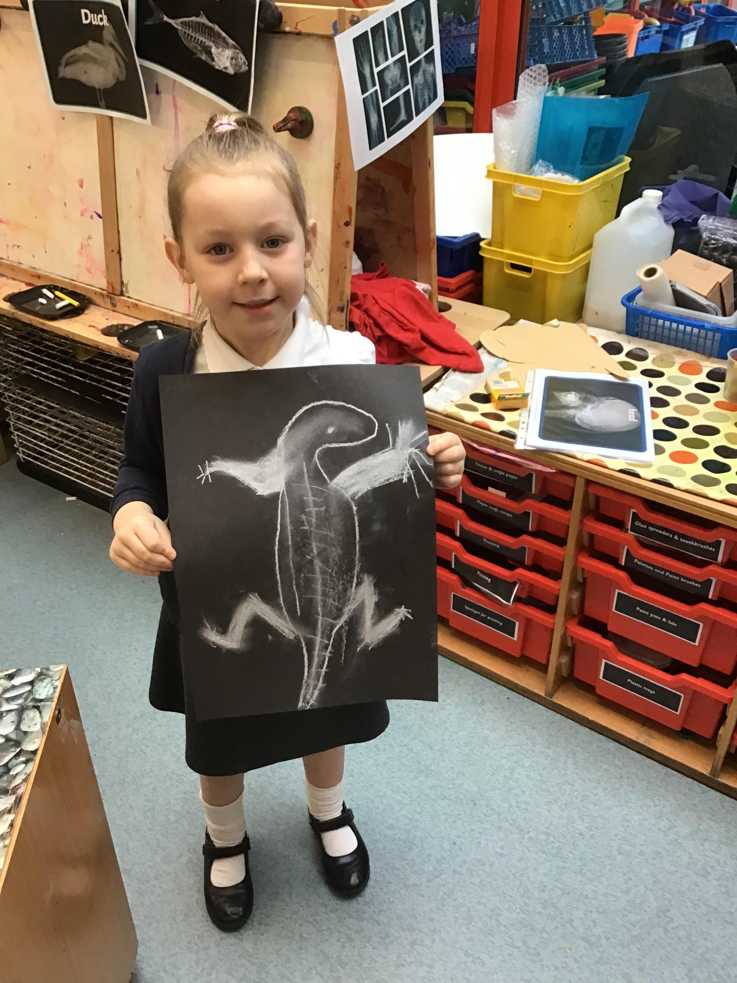 We have been learning about different jobs and looked at books about visiting the doctor or going to hospital. Look at our amazing X ray drawings using chalk on black paper