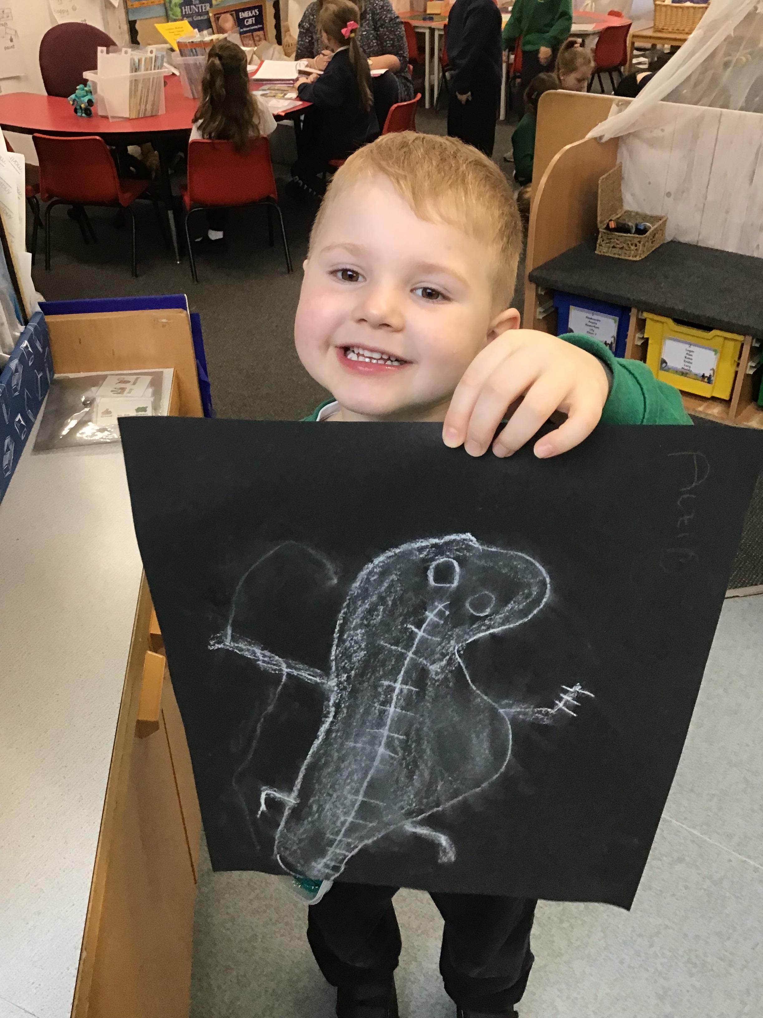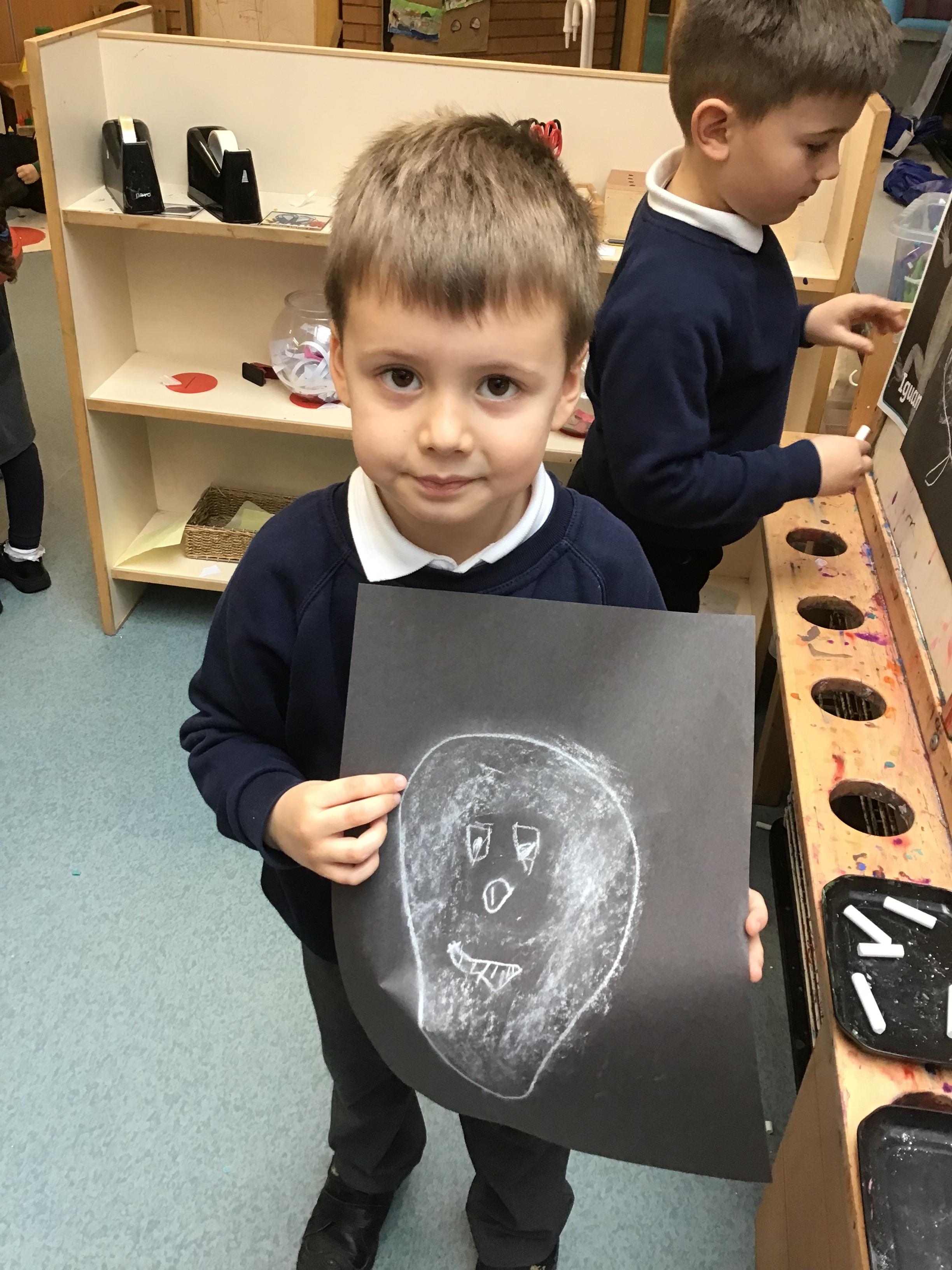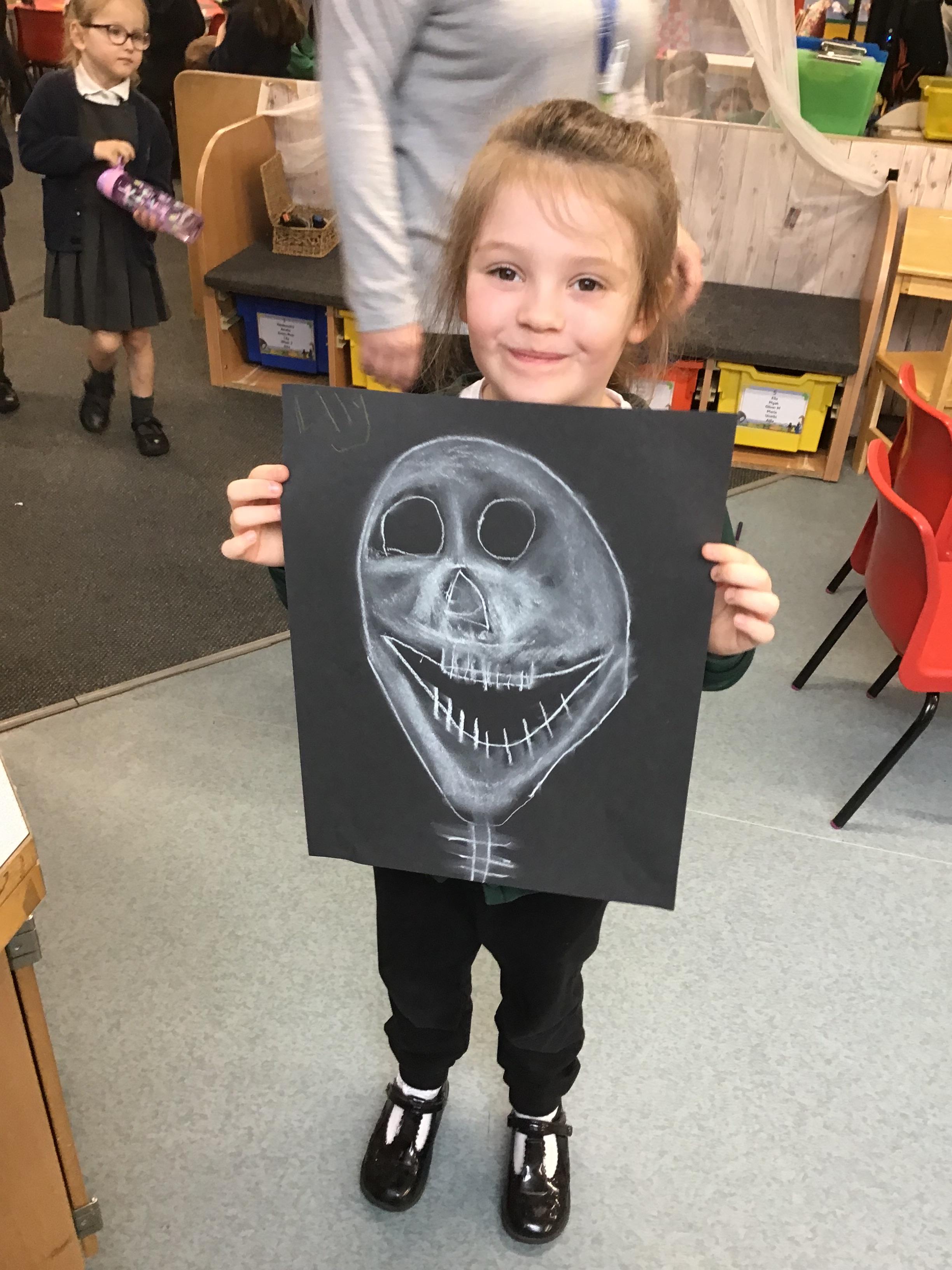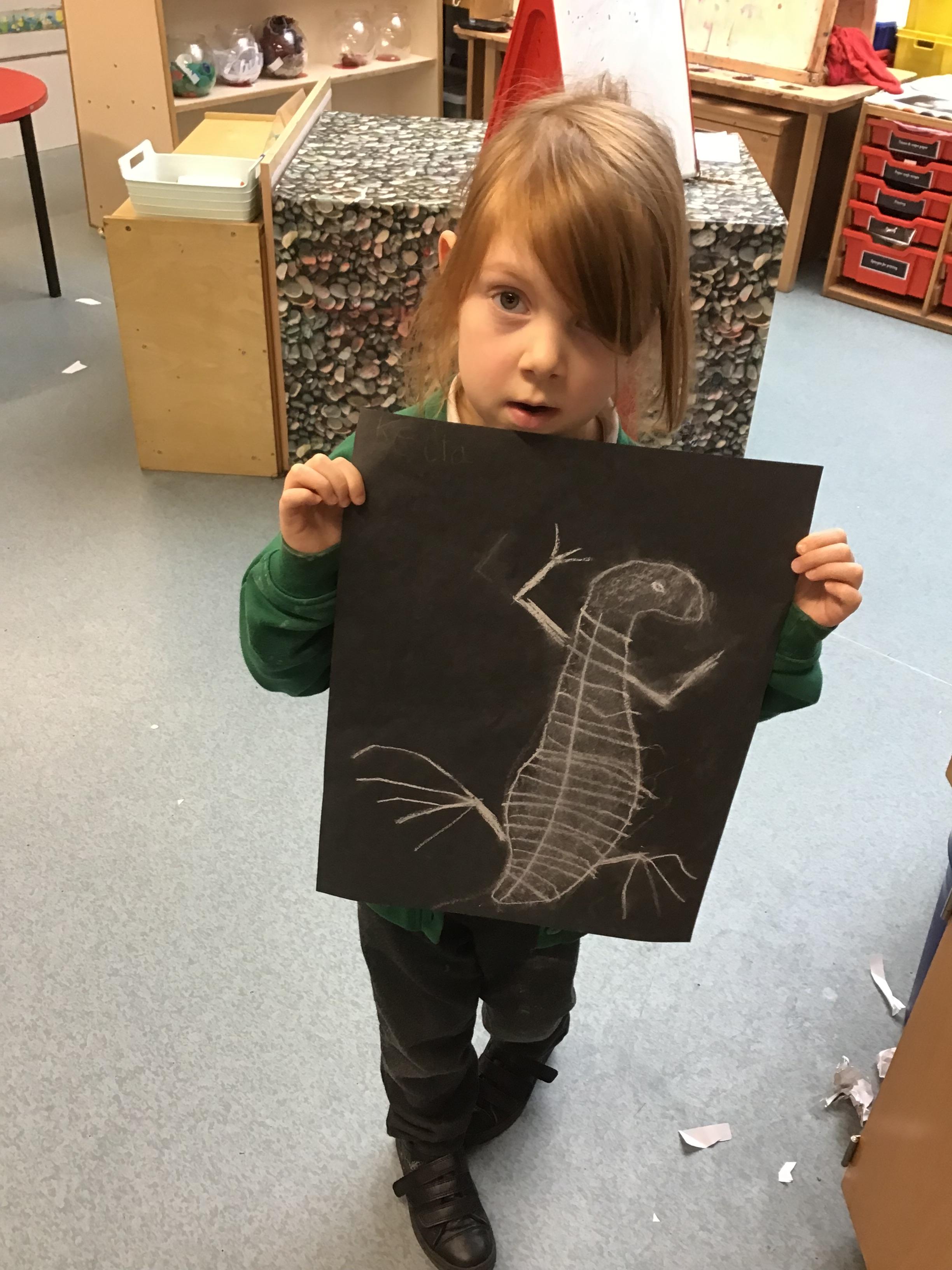 We have been learning about different jobs and looked at books about visiting the doctor or going to hospital. Look at our amazing X ray drawings using chalk on black paper